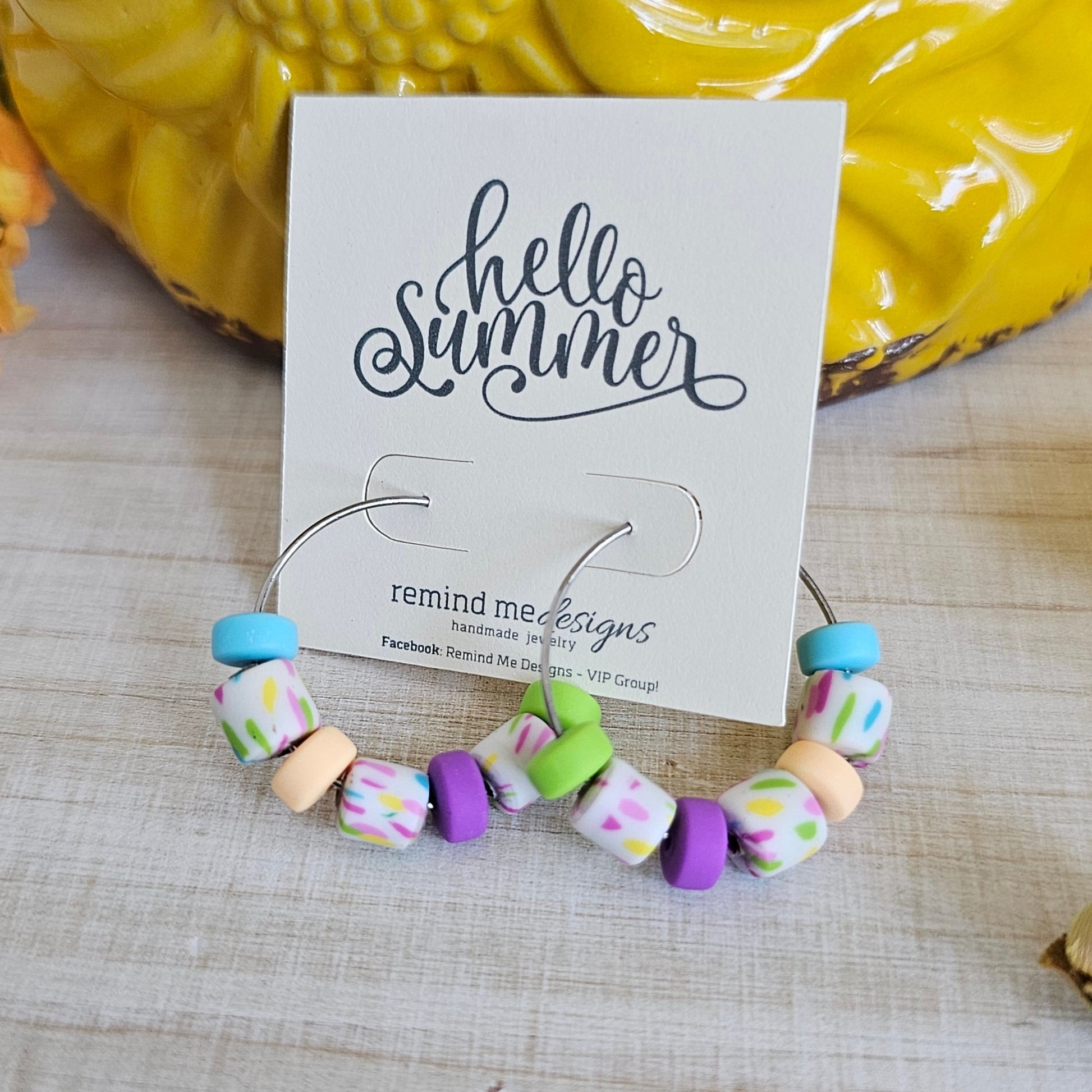 Blue, White, Yellow, Purple and Green Beaded Hoop Earrings