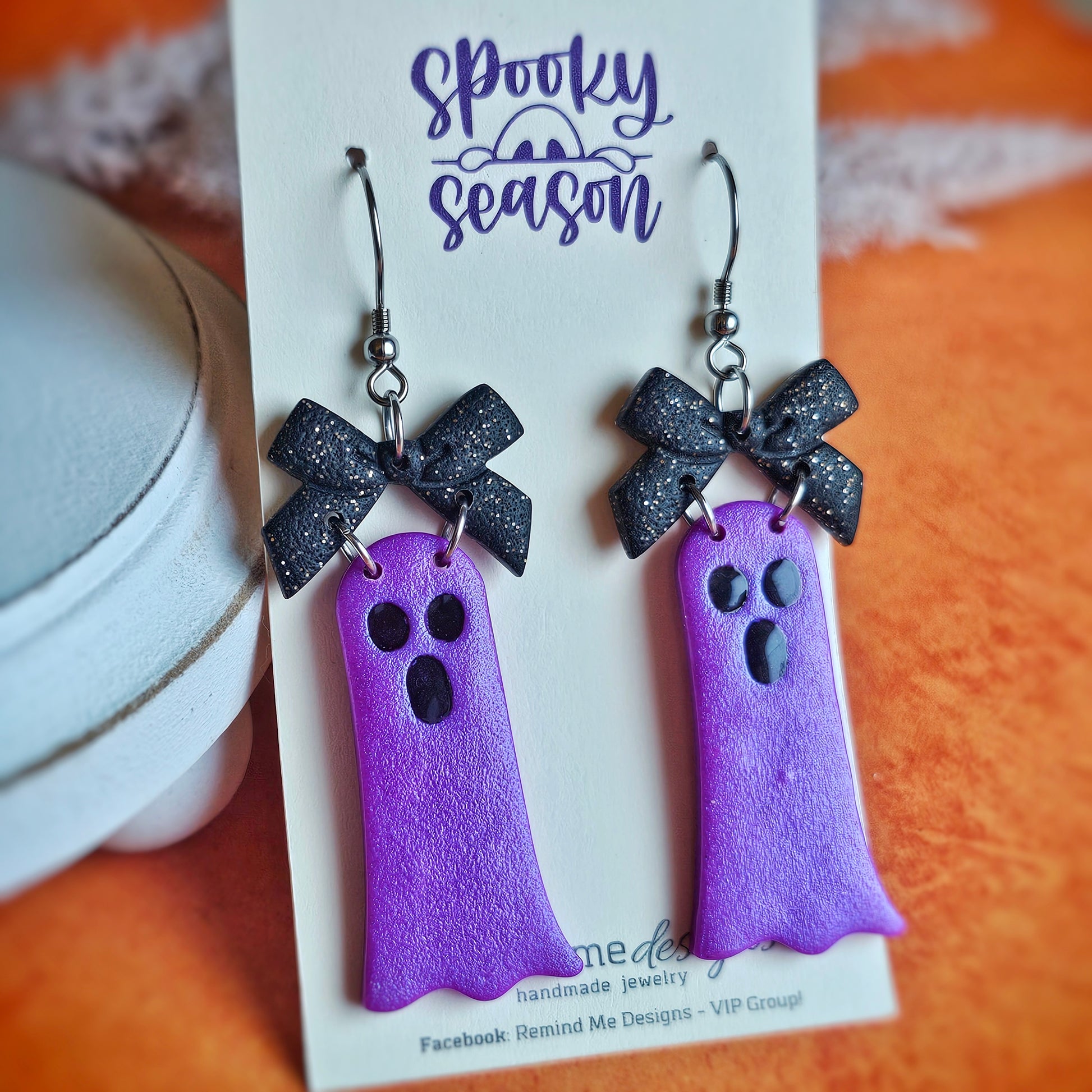 Long Purple Ghost with Bow Clay Dangle Earrings