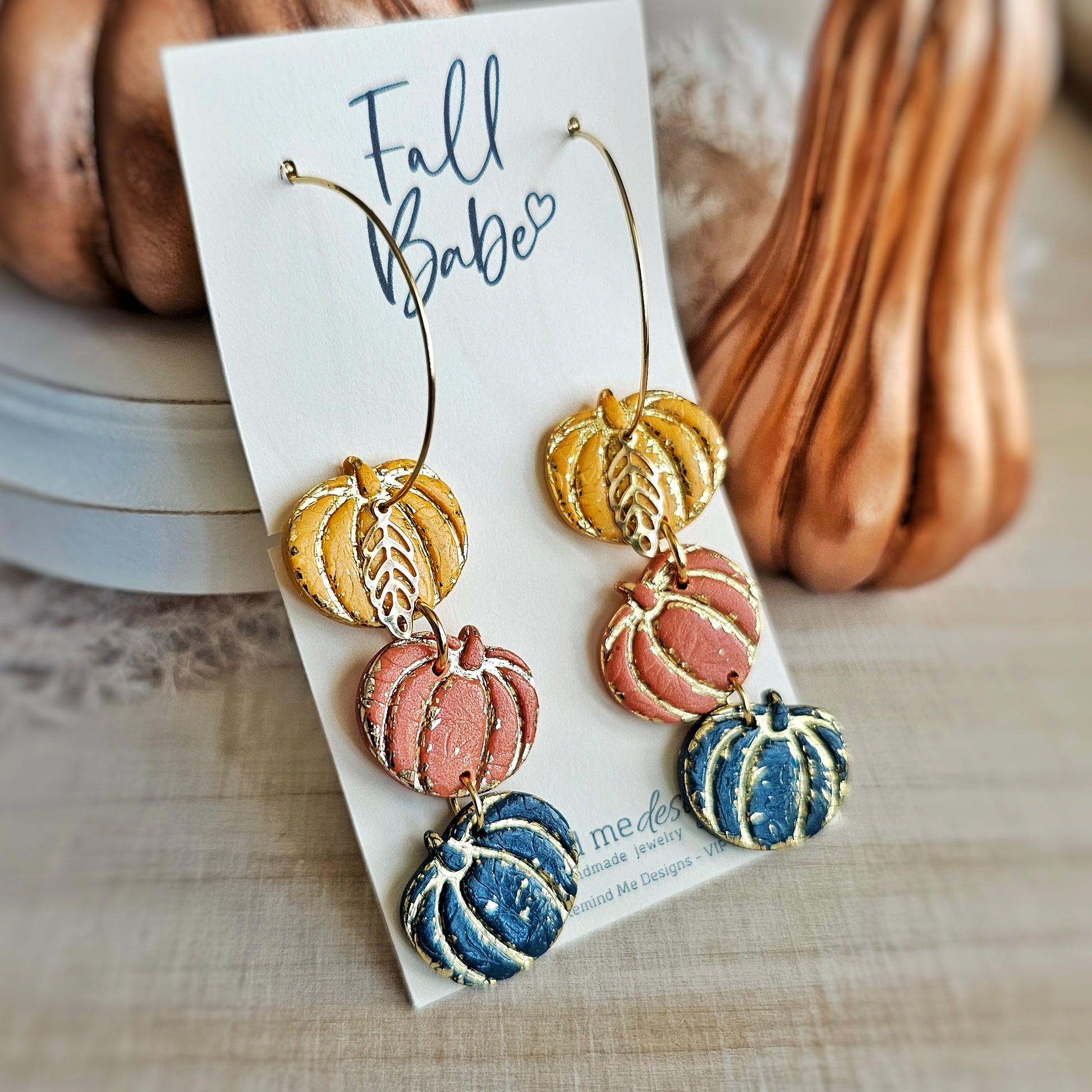 Mustard, Burnt Orange and Dark Turquoise Pumpkin Clay Hoop Dangle Earrings